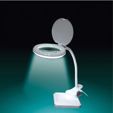 The magnifying lens has a curvature of 3 dioptres, which means it can enlarge images up to 175% of their original sizes, making it ideal for picking out minute details. The lamp has an interchangeable base and clamp so it can either stand on its own or be fastened to a surface. It’s also energy-efficient, with a wattage of just 2.5 W.